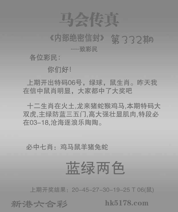 | 332期 | 狗 | 3尾 | 绿双 | 30-39 | 10猴 |