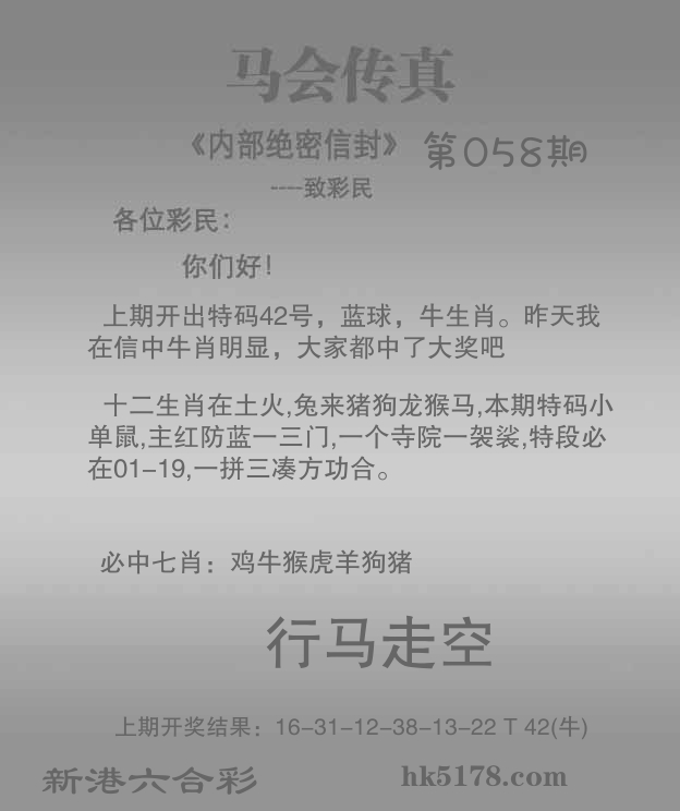 | 058期: ⑦肖 | 猪龙马鸡牛蛇羊 | 猴35中 |